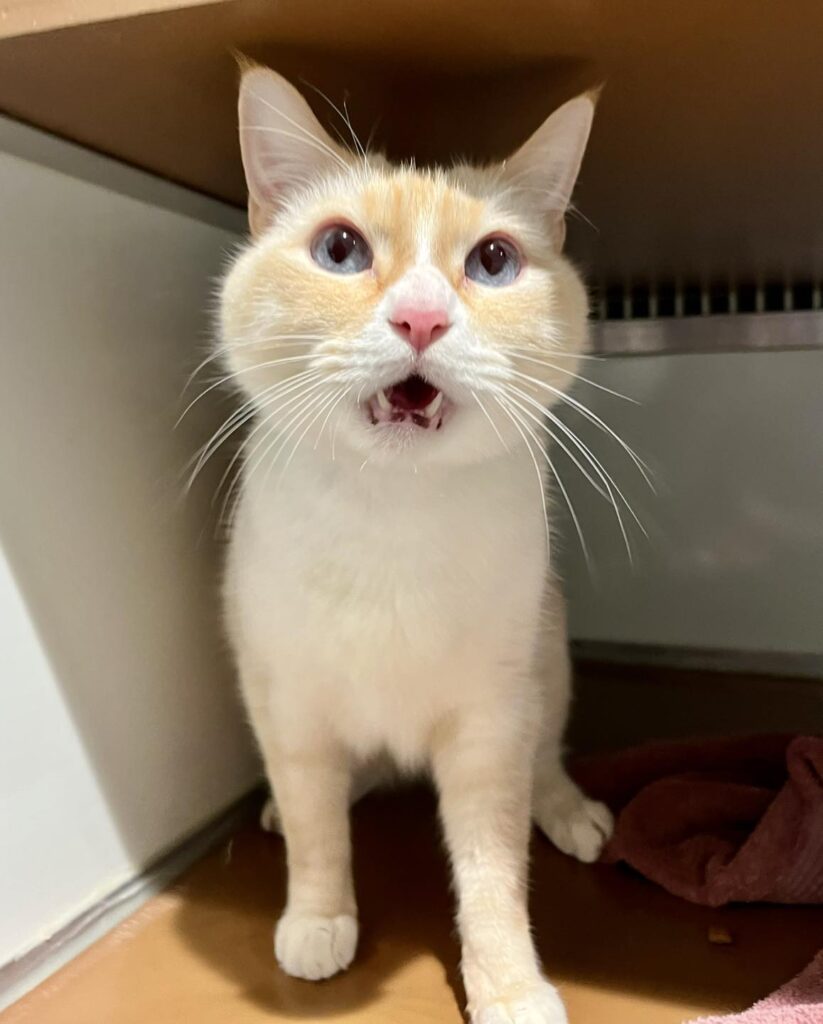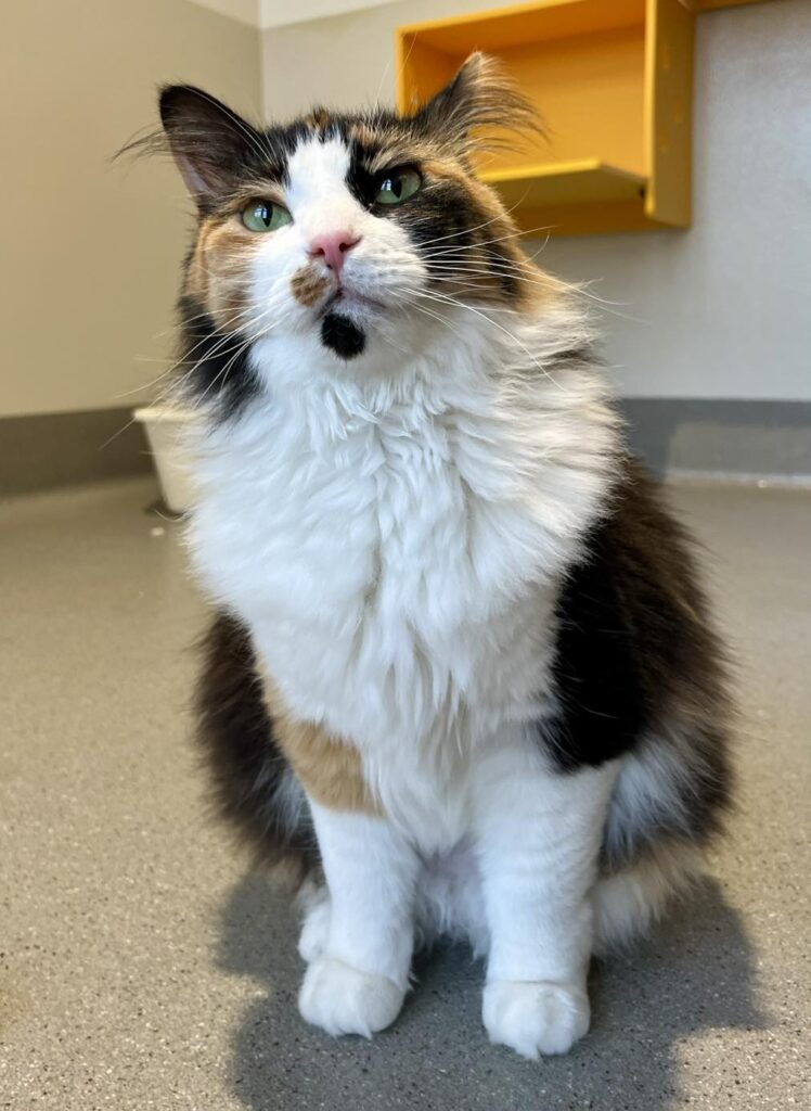 Ele the cat came to the shelter after our animal control officers got a call on our emergency dispatch about a cat meowing loudly in an apartment building near the elevator. They found the cat in the bottom of the elevator shaft, visible only through a crack. Her adopter is the elevator technician who came out and helped us get her from beneath the elevator. Ele was injured: she had a pelvis fracture and badly broken right leg. Our vet team amputated the injured leg and now she’s off to her forever home!