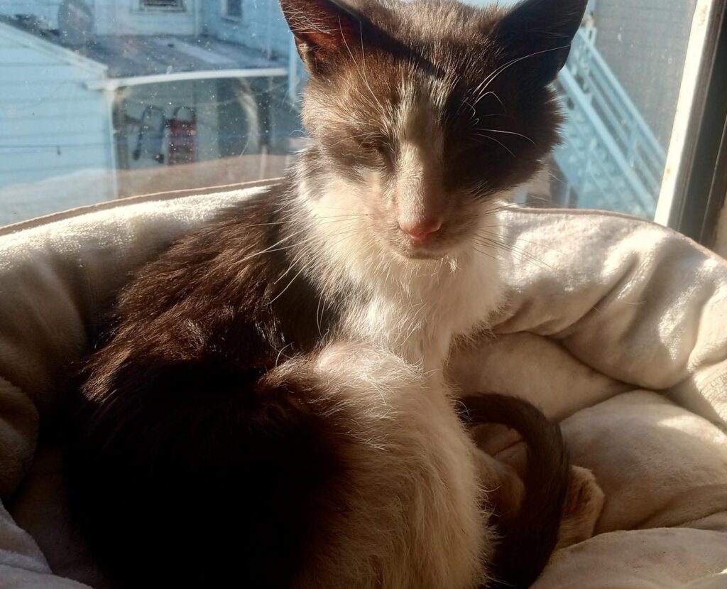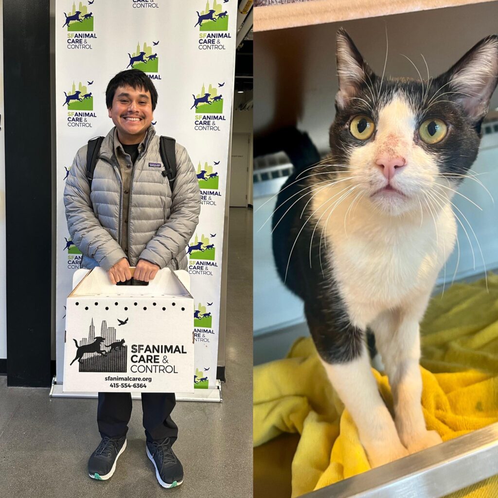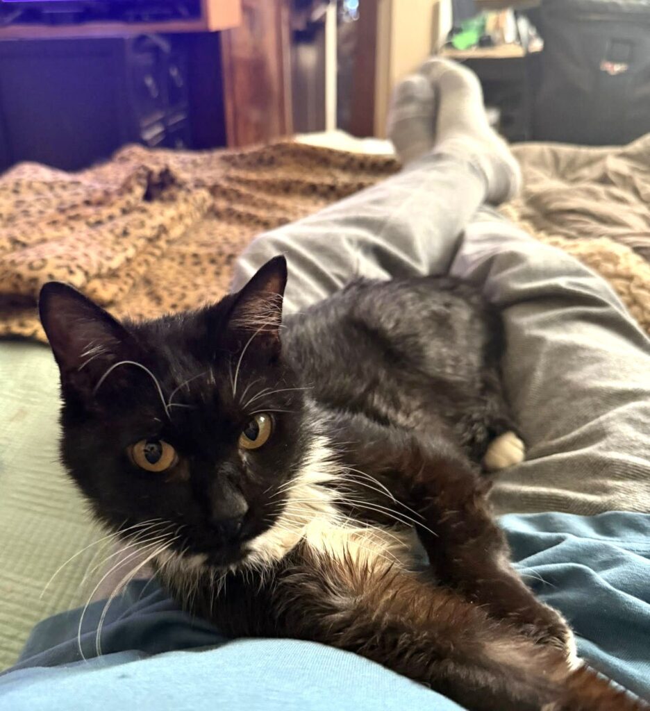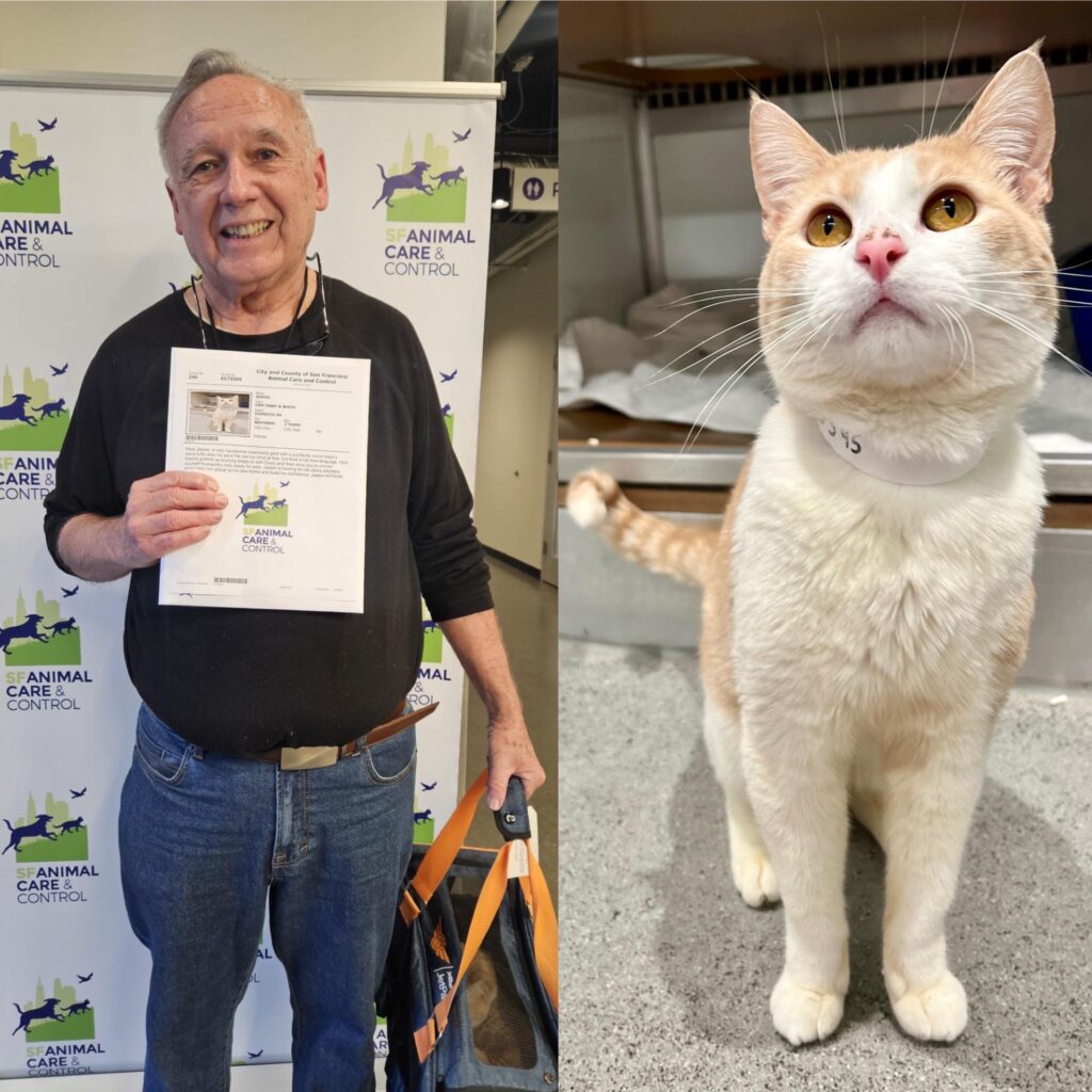 Let’s finish up the year with a fantastic update! When senior tuxie Bruce arrived at our earlier shelter this year, he wasn’t in good shape: He was very thin, his coat was patchy and he had sores and his teeth were terrible. None of that dimmed his fabulous personality. After he had time to gain weight, get a dental, and feel better, Bruce was available for adoption. He was adopted in just a couple of days! An update: “Hello, Bruce’s adopter here, Sorry I took so long to post an update, but I’m happy to report that Bruce is doing wonderfully.