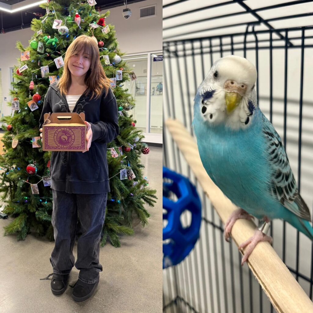 Friendly parakeet Camilla has been adopted. It was her adopter’s birthday: a birthday bird!