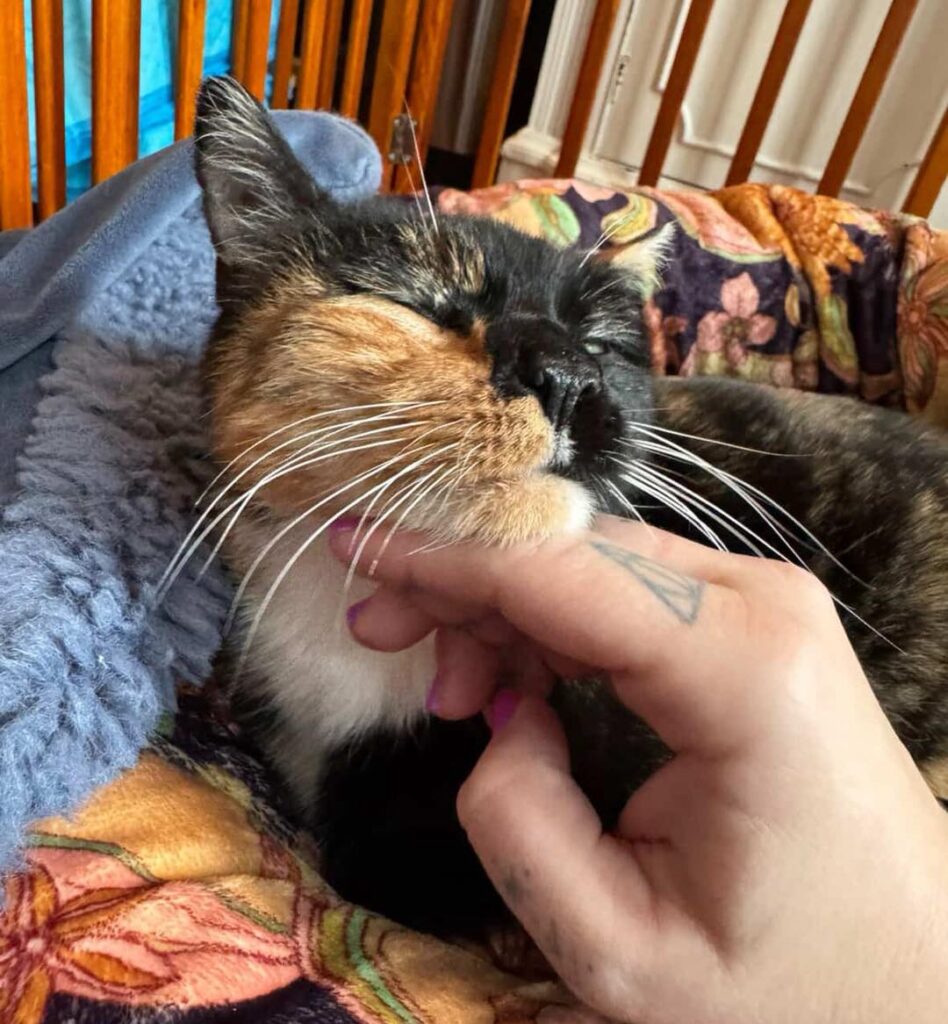 The little guy goes crazy for food, and will devour anything edible. His missing teeth don’t seem to bother him at all. His fur is growing back nicely, and his sores have healed up too. I’m honored to have him with me, he’s a real treasure.”