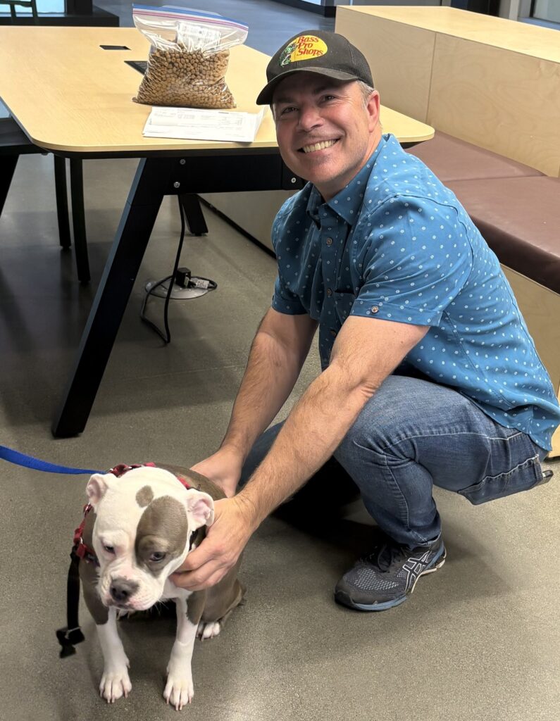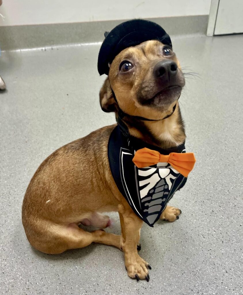Adoption update: “After much discussion Ernie’s official and final new name is Cosmo! He is doing well and is learning lots. He enjoys sweaters, chew toys, and cuddles! He has been practicing some training and is getting very good at sit, stay, and leave it. We absolutely love our little buddy and are so happy he is with us.”