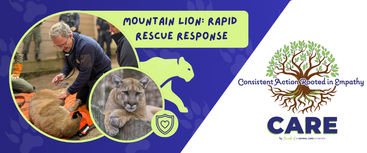 June/2020 – The lost wayward young mountain lion was safely and easily captured and then examined for health and transported to more suitable lion territory. Thanks to a great team effort led by Captain Amy Corso, Animal Control Officer Stephanie Pone, the California Department of Fish and Wildlife and the San Francisco Police Department. Read about this amazing rescue effort in this SFGATE article.